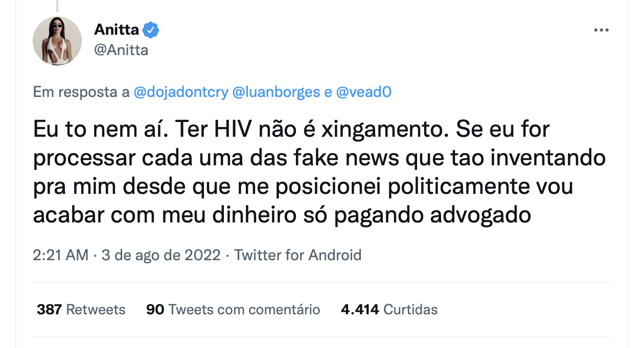 "Eu tou nem aí. Ter VIH não é xingamento. Se eu for processar cada uma das fake news que tão inventando pra mim desde que me posicionei politicamente vou acabar com meu dinheiro só pagando advogado."